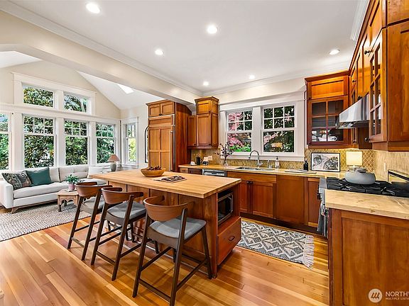 Located on one of the best streets in Laurelhurst ~ The quintessential 1909 Seattle Craftsman: Clinker brick chimney, covered front porch, deep eave roofline defined with corbels. Fir floors throughout the main level were recently refinished and open rooms mean easy entertaining. A vaulted family room off the kitchen pulls in generous natural light. Two sets of French doors create indoor/outdoor flow to the elevated deck and backyard. Upstairs find 3 well proportioned bedrooms with walk-in closets and a large bath. The lower level is a cozy living space with fireplace and built-ins, guest quarters and plenty of storage. Move in ready, host for the holidays and enjoy the Laurelhurst Beach Club next summer.