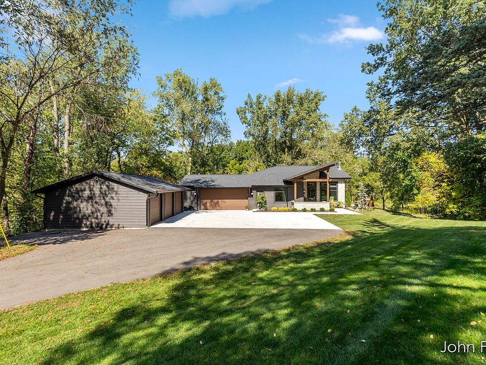 Like-new Mid-century modern 5 bedroom home nestled on 15 acres of wooded privacy. This home has been completely remodeled in 2020 with additional space added. See the ''Amenities'' sheet for all the details. Features of this home include elegant hardwood floors throughout the main level and custom built-ins throughout the home which showcase the quality craftsmanship. The family room features a beautiful fireplace with access to the screened-in porch with infrared heaters for extended enjoyment time. The kitchen features a center island, a double oven, cooktop stove and a large pantry. The primary suite includes the bathroom with in-floor heating and large tile shower. Also included is an additional 3-stall detached garage. Additional features include an automatic stand-by generator, hot tub and the unique trail system throughout the 15 acres. Come take a look at this one of a kind property! Showings begin on Monday, September 29.
