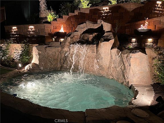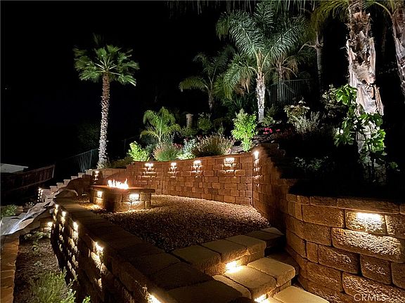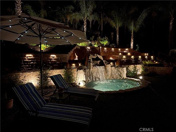 Turn-key, cul-de-sac, custom pool/spa entertainer’s paradise located in the desirable Rancho Bella Vista community. The backyard retreat is a true highlight - professionally landscaped with lush tropical plants and fruit trees, accented by custom hardscaping and landscape lighting throughout. At its heart is a newly resurfaced PebbleTec pool/spa with a cascading waterfall flanked by elegant fire bowls. Multiple terraced levels with custom retaining walls add both beauty and function, featuring an upper terrace with a built-in firepit and additional terraces adorned with citrus and fruit trees - perfect for relaxing or entertaining. Inside, the home offers a bright, open layout with plantation shutters throughout and a gourmet kitchen that flows seamlessly into the dining area and outdoor living space. The main-level bedroom with a stylish barn door - currently used as an office - and full bath offers flexibility as a guest suite or in-law quarters. The inviting family room features a wood-burning fireplace, creating a cozy atmosphere for gatherings. Upstairs, you’ll find three generously sized bedrooms, including a serene primary suite, two full bathrooms, and a convenient upstairs laundry room. Additional highlights include a whole-house fan, newer water heater and dishwasher, and a recently refurbished pool pump, heater, and controller. Located minutes from award-winning schools, shopping, and Temecula’s renowned wine country.