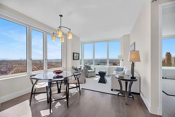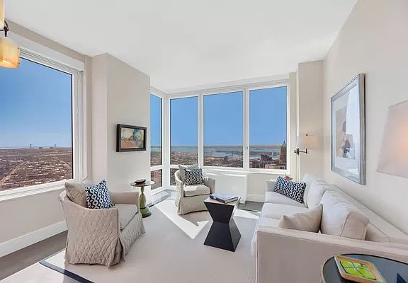 **This sky-high floor-through apartment offers a split two-bedroom layout and it boasts triple exposure with west, south and east views. The two-hundred-seventy degree panorama ranges from One World Trade Center, the New York harbor and the Statue of Liberty, expanding past the Verrazano Bridge, Coney Island, and the Downtown Brooklyn Skyline. With walls of seventeen windows throughout and ceilings at 10' feet high, this residence is light-filled all year round. The unit offers multi-zone air conditioning/heating with wall mounted thermostats and solar/blackout shades throughout. Tax abated for six more years, this property offers a significant amount of savings over the next few years** As you enter this stunning residence, a gracious foyer leads the way to a gourmet windowed kitchen offering a large peninsula with built-in breakfast bar that can accommodate up to four stools. This kitchen is outfitted to an exceedingly high standard with premium appliances and touches - a 30" Liebherr refrigerator, a Viking 4-burner gas cooktop, Bosch convection oven, microwave, and dishwasher - that are elegantly complemented by the white quartz countertops and backsplash, warm gray walnut cabinetry. Custom shelving has been added next to the window.From the corner living room you can entertain while enjoying the amazing city skyline and harbor views through the backdrop of mesmerizing sunsets, in addition to watching fireworks many times throughout the year. The dining space, framed by three large windows, is large enough to accommodate a full dining table and it is outfitted with a chandelier. The corner master bedroom occupies the east wing of the apartment. It offers an oasis like feeling with windowed master bathroom that premiers a walk-in shower with wall nook, white Quartz walls and Lagos Azul limestone floors, a dual cast sink with ample storage underneath and a built-in ceiling heater. Custom teak bench and under sink storage have also been added. Elegant bookshelves in the hallway create maximum privacy from the rest of the home. Light-filled all day, this gorgeous master bedroom offers a daily sunrise spectacle that will not disappoint. Ample closet space and linen Roman blinds are also available in addition to the blackout shades.The west facing spare bedroom offers excellent harbor views, a very large closet and a cubby to store blankets and pillows. The adjacent second bathroom has a bathtub, a white cast sink with storage and a large mirrored medicine cabinet. This bedroom/bathroom combo has been outfitted with a sliding divider by Raydoor in order to offer maximum privacy when needed. Finally, the entry foyer provides a coat closet with custom shelving and a Bosch washer/dryer with overhead shelving. A custom wall-to-ceiling pantry with adjustable shelves has been added by the current owners. 388 Bridge a vast array of luxury services and amenities: - Grand, fully-attended lobby with 24-hour doorman and concierge. - Live-in super and full building support staff. - Sky Lounge with a billiard table and fireplace. - Rooftop viewing terrace with seating and barbecue grills. - State of the art gym. - Party room with separate pantry and service kitchenette. - A multi-purpose room overlooking the children's playroom. - An expansive fifth floor terrace with barbecue grills and an outdoor children's play area. - Optional amenities: on-site parking accessible through the lobby and the Manhattan Athletic Club gym. The building is located two blocks from City Point with Trader Joe's, Alamo Drafthouse Cinemas, Century 21, City Target, and the DeKalb Market Hall. Quick access to the Apple Store, Whole Foods, the Brooklyn Academy of Music, the Barclays Center and quaint brownstone neighborhoods just minutes away.. The best subway access is at your doorstep with A, C, B, Q, R, F, G, 2, 3, 4 & 5 trains and LIRR making for a fast commute anywhere in and out of the city. This is truly the most convenient living that Brooklyn has to offer!