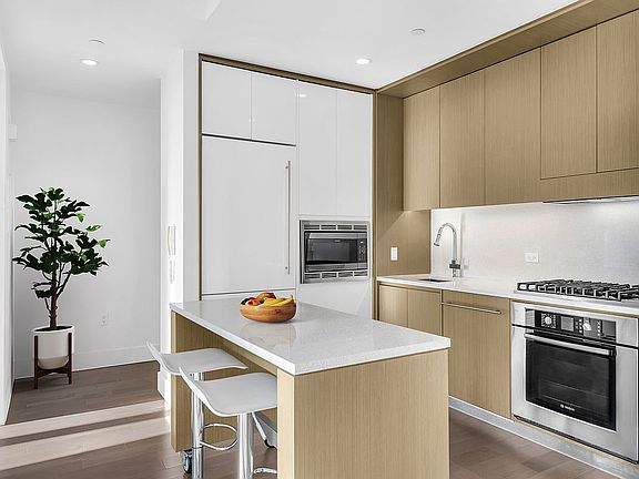Step into this residence and be greeted by a gracious foyer that leads to an expansive living and dining space. The kitchen is equipped with a practical rolling island that can be transformed into a social gathering space or a cocktail bar. Enjoy the beauty of wide-plank oak floors and 10' high ceilings, complemented by oversized windows offering breathtaking southeast Brooklyn views. The living room features a custom wall with a multifunction built-in, providing ample storage space, an entertainment center, a library, and a decorative wall to personalize the space. The kitchen boasts white quartz countertops and backsplash, warm grey walnut cabinets, and a concealed pantry. Top-of-the-line appliances include a Liebherr refrigerator, Viking gas cooktop, Frigidaire microwave, Bosch convection oven, and dishwasher. The generously sized bedroom offers a walk-in closet and eastern exposure, bathing the room in wonderful morning light. The bathroom showcases a custom-designed white quartz cast sink, a mirrored vanity, and a bathtub shower adorned with Metro Anthracite Matte Porcelain Tile, exuding a contemporary style. Additional storage options include a large second closet in the hallway and extra space in the laundry room, where a stackable Bosch washer/dryer is conveniently located.