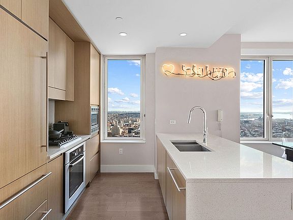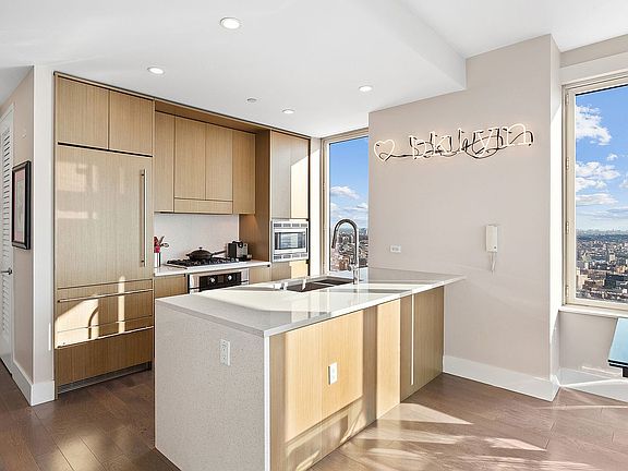 Situated at the end of the hallway for ultimate privacy, enter to discover an elegant foyer leading to the windowed kitchen complete with quartz countertops top-of-the-line appliances by Viking, Liebherr, and Bosch. The kitchen is open to the living area with plenty of room for living, dining, and entertaining with remarkable views of the Statue of Liberty and beyond.