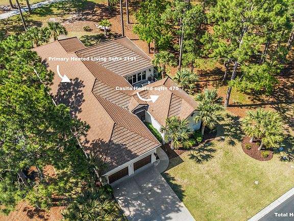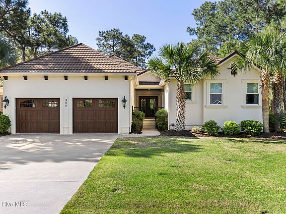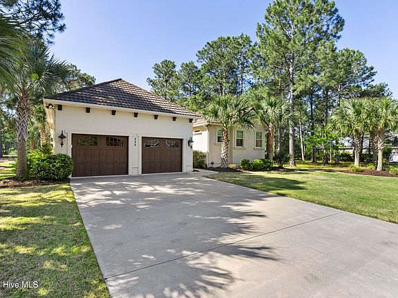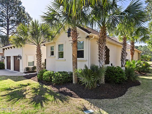 This amazing Mediterranean style home on the Egret 6th tee box of Carolina National Golf club with Stucco siding, a steel decora roof and a beautifully groomed lawn with many palm trees is a must see. The front double doors lead you into a roomy foyer and into this open concept floor plan with trey ceilings and gorgeous engineered hardwood floors. The kitchen has a double island, many cabinets with lighting above and below, double built in ovens, electric cooktop, wet bar, ice maker and much more which would be a dream for entertaining. Just off the kitchen is an office area with two built in desks and laundry room. The spacious dining area has an elegant chandelier which leads you to the stunning living room with built in cabinets which looks out the large sliding doors with a huge covered porch and an amazing view of the golf course. The primary bedroom has trey ceilings as well as many windows for natural light. The primary bathroom has double sinks, soaker tub, walk in shower and linen closet. The immense walk in closet has plenty of room for hanging and storing your clothes and shoes. The secondary bedroom has a large closet and a full bath down the hall. The 475 square foot Casita offers privacy for your guests with a living area, bedroom and full bath with a walk in shower. Winding River offers many amenities such as a club house, fitness center, kayak launch, River house and Marina, Community pool, Holden Beach clubhouse and pool, tennis courts, Bocce ball courts, walking paths and RV and boat Storage. This elegant home is a must see. Book your appointment today!