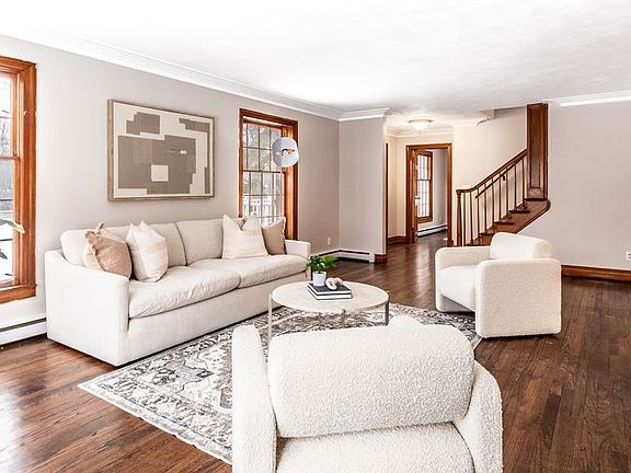 This exquisite colonial residence boasts a serene setting, nestled on over 2.5 acres of land featuring a tranquil small pond. Inside, the beautiful living room showcases a commanding fireplace and an abundance of natural sunlight pouring in through its many windows, complemented by stunningly refinished hardwood floors that run throughout the home. The first floor also features a formal dining room, an office or third bedroom, as well as a modern and well-equipped kitchen with stainless steel appliances and adjacent dining area. The second floor offers a relaxing sitting area, two spacious bedrooms with full bathrooms, and a private balcony providing a serene view of the rear yard. Additional features include a staircase leading to storage in the spacious attic, a two-car attached garage with access to a screened-in breezeway, and a full basement complete with a fireplace-warmed room waiting for your finishing touches.