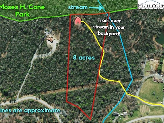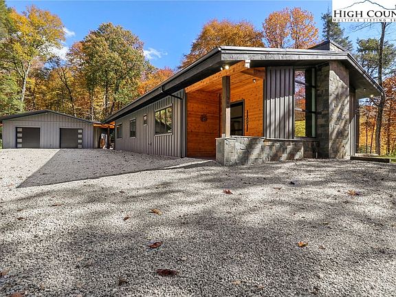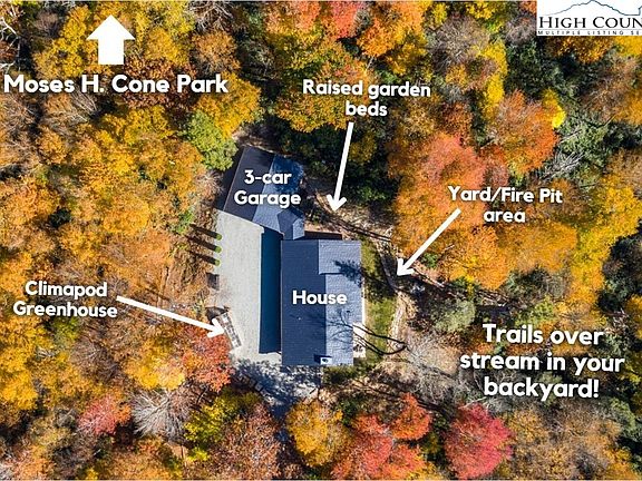 388 New Horizons Way ~ a nature lover's paradise! New (2021) modern, contemporary home on 8 acres adjacent to Moses Cone Park w/ short-term rentals permitted- great for full time residence or mountain getaway! Discover the best of both worlds: a quiet setting tucked in wooded serenity AND a short drive to both downtown Boone & Blowing Rock! This is the unique chance to own property bordering National Park Service land. Close to Moses Cone trails, Mountain to Sea Trail, and the Appalachian Trail! The open floorplan offers ONE LEVEL LIVING w/ concrete floors, rustic tiled fireplace, well-thought-out kitchen w/ butler's pantry & SS appliances, & cathedral T&G ceiling. Large glass doors open the living to a covered back porch overlooking flat yard- bringing the outdoors, in! The primary suite has large windows, spacious BA w/ abundant natural light, walk-in closet, & vaulted ceiling (gas line in place = easy fireplace addition)! 2nd BR & full BA, laundry, & bonus room off living, currently used as study/office- could easily be converted to 3rd BR (w/out having to expand septic)! Oversized, finished 3-car garage w/ storage, organic gardens, Vego Garden raised beds, Climapod greenhouse!