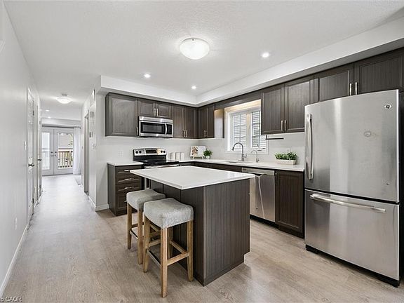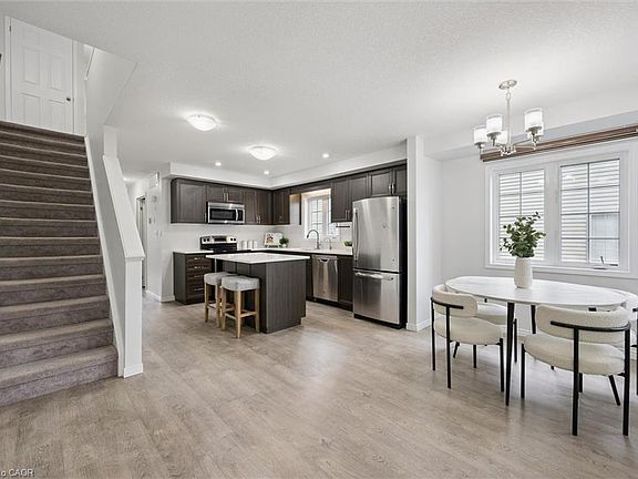 Welcome to this charming 3-bedroom, 1.5-bath stacked townhome offering 1,420 sq. ft. of stylish living space in a quiet, family-friendly neighbourhood. The open-concept main floor boasts sleek vinyl flooring, a convenient powder room, in-suite laundry, and a bright living room filled with natural light. Step outside to the spacious deck—a perfect retreat for morning coffee, evening sunsets, or entertaining friends—with the added bonus of extra storage neatly tucked under the deck. At the heart of the home is a modern kitchen, thoughtfully designed with ample cabinetry, stainless steel appliances, quartz countertops, and a large island with a breakfast bar—perfect for everyday living and effortless entertaining. The adjoining dinning area creates a warm and inviting space for family meals and gatherings. Upstairs, you’ll find three generously sized bedrooms, each with ample closet space, along with a beautifully appointed 4-piece bathroom featuring a shower/tub combo. Conveniently located just steps from schools, shopping, and scenic walking trails, this home is also minutes from Conestoga College, RBJ Schlegel Park, and offers quick access to Highway 401. Don’t miss the chance to make this delightful townhome your own—where comfort, style, and location come together seamlessly!