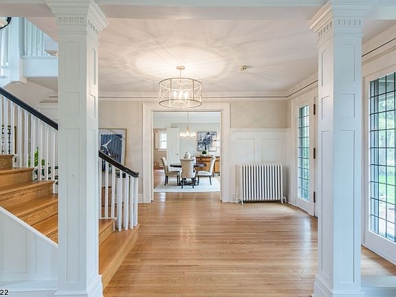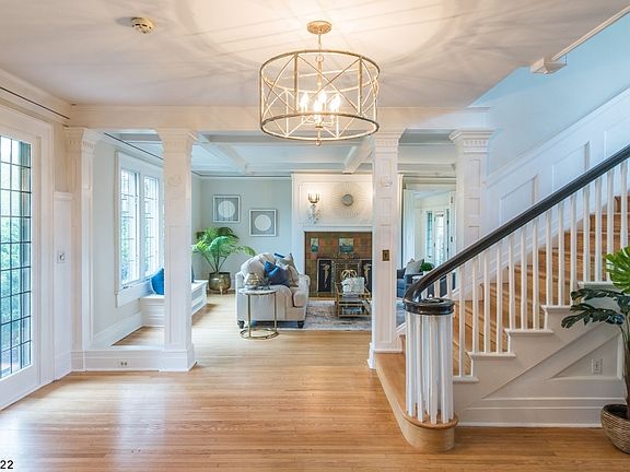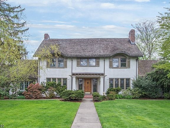 One of a handful of homes in Glen Ridge designed by renowned architect Dudley Van Antwerp, this distinctive property is often referred to by the locals as "the house with the roof." The unique wood shingle roof replicates the thatched cottage roofs commonly found in the English countryside. Some of the notable features include the impressive foyer and staircase, nine foot ceilings, unique leaded windows, nautical themed tiled fireplace, carved columns, double doors with molding. A sizable kitchen/family room addition with a huge center island that seats 5+ provides a modern floor plan and flow. Expansive new trex deck with retractible awning overlook the deep landscaped yard. Easy access to NYC trans -15 min walk to Bay St station or jitney at the curb. This home does not disappoint inside or out!