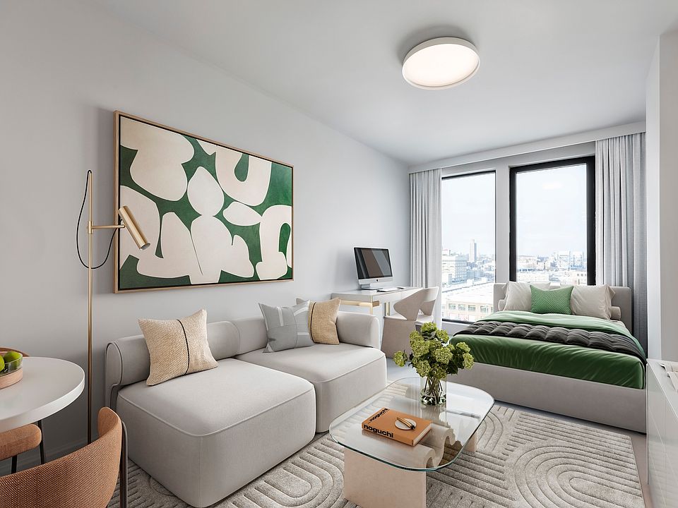 Inwood Living features a mix of graciously appointed studio, 1br, 2br 3br layouts, with few select units featuring private outdoor space. A blend of modern naturalism, each unit features floor to ceiling windows, wide-plank flooring in natural blonde and tall ceilings that enhance the sense of spaciousness and light. Modern kitchens boast silver sand Quartz counters, abundant custom design cabinetry, and a stainless steel appliance package that elevates both style and functionality. Retractable kitchen faucets, Washer/Dryer in unit, integrated microwaves, dishwashers streamline meal prep and ensure effortless cleanup in this contemporary culinary sanctuary. Ample closets space.