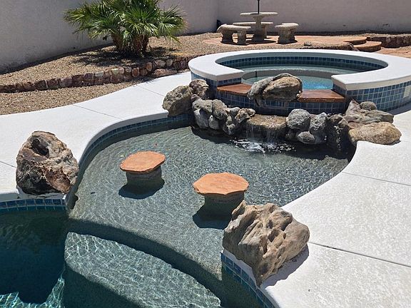 Private pool and spaGas fireplaceOpen floor planBreakfast barNew tile floors