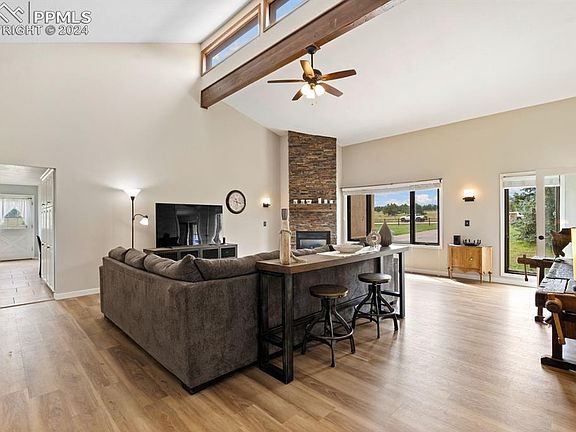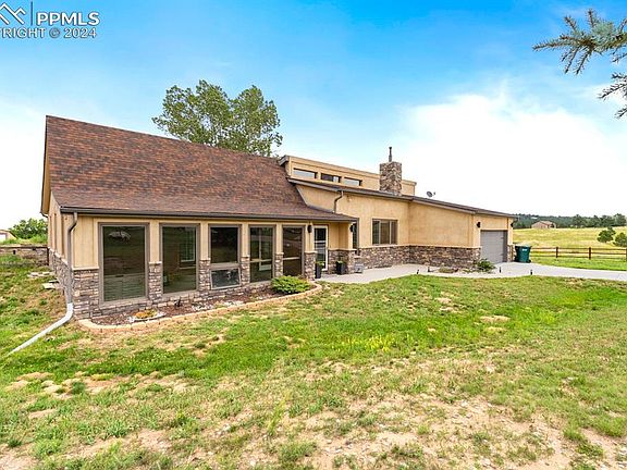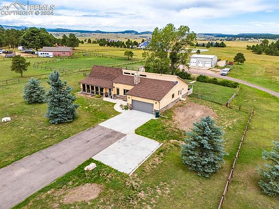 Welcome to this stunning property nestled on 5.52 acres in the highly sought after Black Forest area. Zoned Horse property that is fenced in, wonderful flat field for grazing and a loafing shed. Additional driveway with electric gate will take you to the back of your property that has a workshop with 3 garage doors, 2 have garage door openers, one for an RV garage and the other for the main spot, work bench, shelving and garage heater in this spacious shop. Updated ranch with main level living with radiant heated floors. Enjoy your evenings in the Front sunroom with a hot tub and expansive windows. Enter the massive family room with vaulted ceilings and real wood beams and floor to ceiling fireplace that serves as a focal point, perfect for chilly Colorado evenings. Freshly painted walls and new LVP flooring on main level living room and dining room, hall. Master bedroom with en-suite bath with spa like shower and double shower heads. Additional 2 bedrooms and full bathroom offering comfort and privacy for guests or family members. The Kitchen is a chef's dream with stainless steel appliances and a large island that doubles as a gathering spot for family and friends with an additional dining space that also goes to the covered patio to enjoy the Colorado sunsets. Basement provides 2 additional bedrooms and a full bathroom and large family room. Back yard is fenced in with a gate to secure your pets. Whether you are sipping your morning coffee while watching the sunrise or star gazing by a firepit under the clear Colorado sky, this property is more than just a home-It's your own piece of paradise!