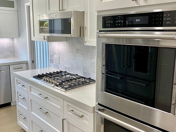Completely remodeled kitchen featuring high-end stainless steel appliances, elegant quartz countertops, new cabinetry, and designer tile backsplash