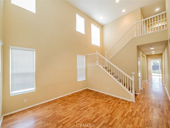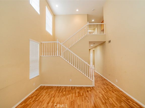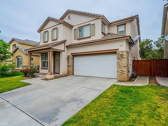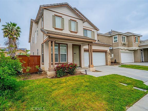 Welcome to the highly desired community of The Villages of Avalon. This home features 4 bedrooms, 2.5 baths, and 2,313 sq ft of living space with a 3-car tandem garage. You are welcomed from a covered front porch and upon entry greeted by the living room/dining room combo with a 2-story ceiling and lots of high windows to bring in the natural light. The family room has a fireplace and media niche that flows into the kitchen with an island, recessed lights, laminate flooring, a walk-in pantry, and abundant cabinetry. The second floor has all 4 bedrooms, 2 baths, and a convenient laundry room. The Primary bedroom faces the backyard with mountain views, has an ensuite bath with dual sinks and a vanity area in between, a separate tub, a walk-in shower, and a walk-in closet. Two secondary bedrooms share a bathroom with a shower/tub combo. Laminate flooring on the first floor in the hallway, living room, dining room, kitchen, and half bath. Large pool size backyard. The affordable HOA amenities include a pool, spa, tennis courts, BBQ area, and a playground—a convenient location, close to 215 FWY and right across from the Perris Fairgrounds.