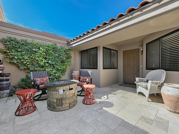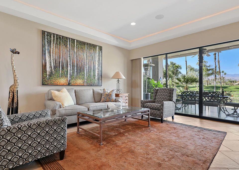 This beautifully updated 2-bedroom, 2.5-bathroom plus den condo is set in the best location in Palm Valley Country Club, offering unobstructed views of the majestic Jacinto Mountains and lush fairways. The den can be easily converted to a 3rd bedroom adding flexibility to accommodate your lifestyle. The open, sun-filled floor plan features vaulted ceilings, designer finishes, and a modern kitchen with granite & quartz countertops, custom cabinetry, and stainless steel appliances. A separate dining room provides a dedicated space for formal meals or entertaining, complemented by a bar area off the living room for added entertainment. The spacious primary suite includes the convenience of in-unit laundry, while the second bedroom is bright and inviting.Enjoy resort-style outdoor living with a private patio and additional courtyard, perfect for gatherings, relaxing evenings, or soaking in serene desert views.Additional highlights include updated flooring, recessed lighting, ceiling fans, and abundant storage, plus a dedicated parking space. Palm Valley Country Club amenities are second to none: two championship golf courses, 46 pools and spas, tennis and pickleball courts, a fitness center, and an active clubhouse for dining and social events.Whether you seek a full-time residence, seasonal retreat, or investment opportunity, this condo offers resort-style luxury, incredible value, and a prime Palm Desert location just minutes from El Paseo's shopping, dining, and cultural attractions.