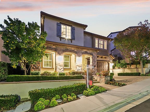 Stunning former model home with breathtaking hill views from both floors and approximately $300K in premium upgrades on a highly desirable view lot. The interior boasts hardwood and stone tile floors, French maple cabinetry, beamed ceilings, built-ins, stone accents, wooden shutters, and surround-sound prewire. The gourmet kitchen features ceiling-height cabinets, a large island, and Thermador stainless steel appliances, including a 48" oven and pot filler. The great room flows effortlessly through an expandable glass wall to a covered patio, creating seamless indoor-outdoor living. A convenient first-floor bedroom and full bath add flexibility. Outdoors, enjoy a finished backyard with a covered tile patio, faux beams with pendant lighting, a built-in KitchenAid BBQ with seating, and a gas fire pit—all overlooking rolling hills. Ideally located near top-rated schools with excellent access to commute routes, this home offers luxury, style, and unparalleled views at every turn.
