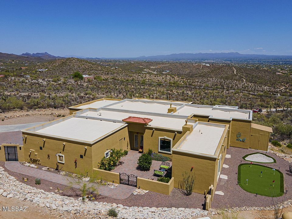 Luxury custom-built home completed in 2023, perched atop a hill in West Tucson with commanding views of Downtown Tucson, A Mountain, and the Rincon & Catalina Mountains. This 4-bed, 5-bath, 4,925 sq ft home is a perfect blend of modern elegance and off-grid living with a dedicated generator and propane tank. The open-concept design features expansive living spaces, floor-to-ceiling windows, and high-end finishes throughout. Enjoy seamless open space indoor-outdoor flow, spa-inspired baths, a gourmet kitchen with stainless steel appliances, and multiple covered patios. Practice your golf game with a putting green overlooking the city. A rare offering of privacy, sophistication, and sustainability just minutes from city conveniences.