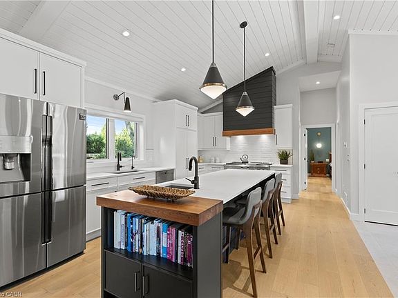 On one of the most desirable streets in the area, this stunning 5-bedroom, 3-bathroom ranch bungalow offers a rare combination of luxury, comfort, and craftsmanship. Completely rebuilt from top to bottom, it has been professionally designed by Jordan Station Design Co., interiors by Jen Nickel (Invision Design Solutions), and built to perfection. Every major systemroof, HVAC, plumbing, electrical, insulation, windows, and exteriorhas been replaced or upgraded for true peace of mind. The inviting exterior features a Hemlock timber portico with a cozy gas fireplace, composite Everlast cladding, decorative stonework, LED soffit lighting, and beautifully landscaped grounds with concrete driveway, walkways, and patios. Step inside to soaring vaulted ceilings, rich engineered hardwood, and custom Millbrook cabinetry that set the tone for sophisticated open-concept living. The chefs kitchen is a showpiece, with Caesarstone counters, a centre island with prep sink, coffee bar, and premium appliances including a 48 GE Monogram gas range, Miele dishwasher, and Samsung 4-door fridge. The great rooms floor-to-ceiling tiled gas fireplace and oversized windows create a bright, inviting space for gatherings. The primary suite is a private retreat with a spa-inspired ensuite. A fully finished lower level features a second kitchen, custom bar with wine fridge, gas fireplace, and large egress windowsideal for entertaining, guests, or multi-generational living. Additional highlights include spray foam insulation, Carrier humidity-controlled HVAC, tankless water heater, water softener, and designer fixtures throughout. This is more than a homeits a turnkey lifestyle in one of Niagaras most sought-after locations.