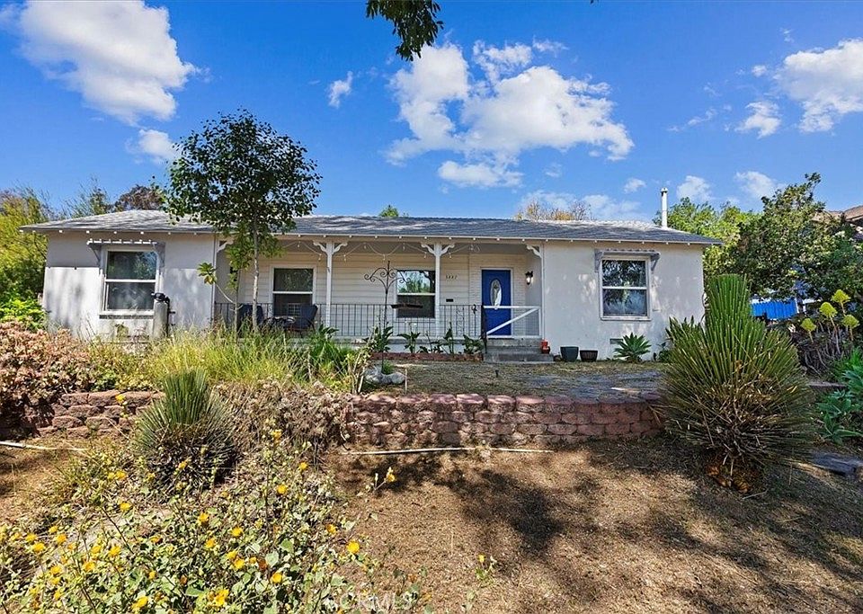 Charming 1941 bungalow near Mt. Rubidoux and Downtown Riverside, featuring a bright blue door and welcoming front porch. This turnkey home is nestled above the street on a large, serene lot with water-wise landscaping. Inside, white oak hardwood floors flow throughout. The updated kitchen boasts woodblock countertops, cabinets, and a walk-in pantry, opening to a light-filled dining room—perfect for entertaining. A spacious living room centers around a cozy fireplace, flanked by French doors that open to a sunlit back patio. Both bedrooms offer ample space and large closets, complemented by a modern hall bathroom with double sinks and stylish tiling. Enjoy a generous backyard with a covered patio, fruit trees, a garden shed, and potential RV parking. Energy-efficient features include dual pane windows, a high-efficiency roof, an electric car charger, and fully-paid solar panels. A must-see to appreciate its charm and features.
