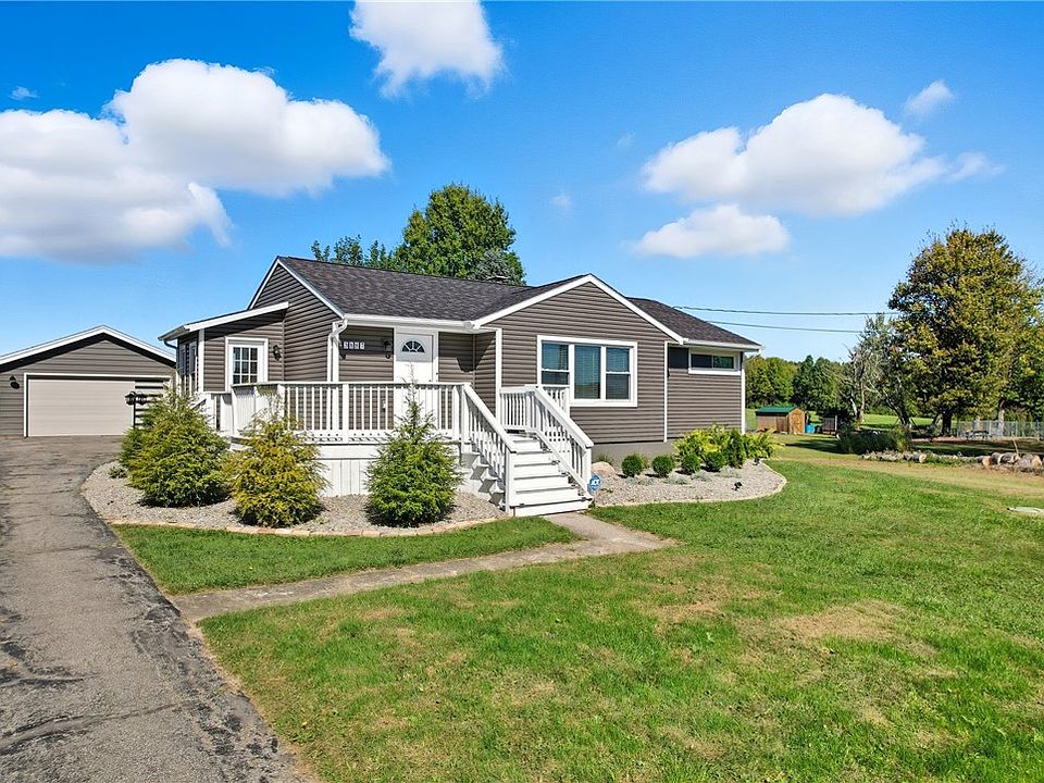 Ranch-style 3 bedroom, 1.5 bath home on a scenic country property near the Shenango Reservoir with swimming, fishing, boating and water sports. The main floor offers a spacious living Room/Dining area combo, Kitchen, 3 Bedrooms and full bath, all updated within the last 4 years. Clean basement with laundry, storage, and 1/2 bath. Outside is a 2 car detached garage, with newer garage door motor, and a large front porch! Recent upgrades include roof (2022), furnace, AC, hot water tank (2023), stainless steel Kitchen appliances, public sewer (2023), plus new landscaping and privacy fence. ADT system for added security. This beautiful condo alternative is truly move in ready, plus being offered almost completely furnished! Truly a must see!