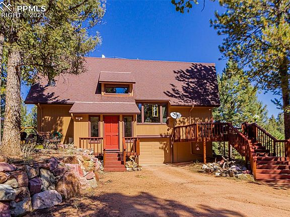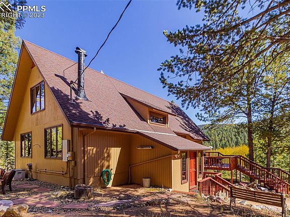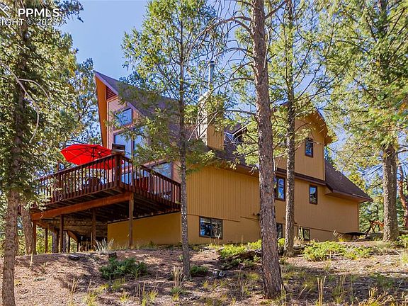 You’ll feel at one with nature! This chalet-style home has been cherished by its long-time owners, and pride of ownership really shines through. You'll be smitten with the beautiful drive to the home right now while the aspens are changing! Highlights include a stunning wall-of-windows that provide year-round scenery, vaulted TNG ceiling, a spacious Master Suite, a Loft, an oversized Garage, basement workshop, and a truly amazing deck from which to enjoy your outdoor living space. The Kitchen has been updated with granite counters, a high-efficiency induction range, ceramic tile flooring, oak cabinetry, and a look-through window to the Living Room. The wall of windows faces east for sunny mornings that let in gorgeous natural light. The open-concept Living Room gives that airy feel with its vaulted ceilings leading your eyes up to the Loft. The woodstove is set in natural stone hearth and surround, ensuring cozy, warm winters. The Primary Bedroom Suite has an adjoining bath, 2 closet options, and plenty of space for furniture. The Basement is waiting for you to finish and make it all your own! There is a bonus Hobby Room, a workshop space, Laundry, and huge storage area. New furnace and new 200-amp electric service panel installed in 2022. The oversized 1-car Garage has extra side space for motorcycle, bicycles, snowplow, or ATV. You might want to spend all your time on the deck, the back patio, or just walking around your private acreage…either way, it is time well spent! Moose, deer, elk, turkey, fox, birds, and squirrels all love it, too! Ridgewood is located 13 miles north of Woodland Park not far from Manitou Lake. This area is well known for its beauty and outdoor recreation. Nearby Manitou Lake is stocked for fishing, there are hiking, biking, horse, and snowshoe trails all around, and world-class fly-fishing and rock climbing are just down the road. This home checks all the boxes! Take a short drive and see this beautiful home for yourself!
