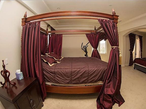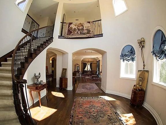 Privately situated on over one acre in a sought-after Calabasas community, this Mediterranean Contemporary residence offers nearly 6,000 square feet of living space. Built in 2013, the home features 5 bedrooms and 6.5 bathrooms with a thoughtfully designed floor plan.Interior highlights include a two-story entry, hardwood flooring, formal living and family rooms with fireplaces, dining room, bonus room, loft, and a wet bar. The primary suite offers a fireplace, walk-in closet, and full bathroom. The kitchen is designed for functionality with custom cabinetry, a large center island, pantry, stainless steel Viking appliances, and travertine finishes.The property is equipped with a security system and provides multiple spaces for entertaining. The backyard includes a built-in barbecue, mature fruit trees, waterfalls, fire pit, and a custom stage with professional audio/video wiring. Outdoor areas are designed for gatherings, performances, and recreation. Proprty is set high on a private hilltop, this estate is accessed through its own gated drive, offering both privacy and security. As you enter, a separate motor court provides parking for 8-10 vehicles. The kitchen is equipped with top-of-the-line Wolf appliances. If leased furnished, the home features hand-carved, custom designer antique furniture of exceptional quality.