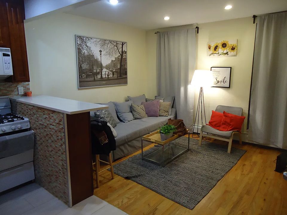 Spanning approximately 1,200 sq ft, this beautifully renovated apartment sits on the first floor (one easy flight up) and offers a modern open-concept layout ideal for both living and entertaining. The large living room flows seamlessly into a sleek kitchen with ample counter space, a built-in microwave, and plenty of room for bar stools.