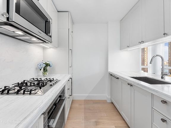 Best One Bedroom in stunning New Development! Fabulous price - avoid paying transfer tax and Sponsor's closing costs! This is a Resale and Owner occupied. You will love this gorgeous corner home with Floor-to-Ceiling windows, Skyline views, high ceilings and modern interior designed by architect-designer, Paris Forino. The designer custom Italian kitchen features a breakfast bar, Miele appliances, paneled refrigerator and white marble countertops. The large master bedroom is elegant with a fabulous walk-in closet. The bathroom features Dolomite marble floors, custom vanity with self-lit mirror, Toto toilet and deep soaking tub. This home also offers the convenience of a washer and vented dryer. Luxurious lifestyle amenities at 389 E89 include 24 hour attended lobby, fitness center, residents' lounge, children's playroom, outdoor courtyard with BBQ and spectacular roof deck with 360 degree skyline views. Enjoy the finest museums, premier boutiques and restaurants, parks and more!