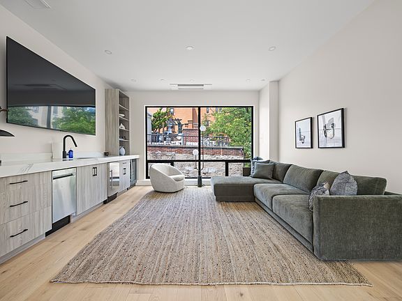 Highlights include wide-plank white oak floors, radiant heat in the primary bath, split AC units throughout, and a chef's kitchen with a nearly 10-foot quartz island and GE stainless steel appliances. The soundproofed primary suite offers a spa-like retreat, while additional bedrooms and a versatile garden-level lounge provide room to relax, work, or host.