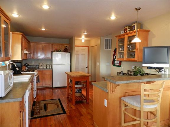 Warm and inviting with a wonderful view over Moscow, this spacious home is located in a nice cul-de-sac at the north end of town. The main level has 3 bedrooms, 2 baths and a vaulted ceiling, open living area with wood floors in the kitchen and dining room. In the basement is a large family room, 2 more bedrooms, a den/6th bedroom and big laundry room with storage space. There is an upper deck and lower patio that leads to the large fenced yard. A vegetable garden, firepit, strawberry patch and perennials