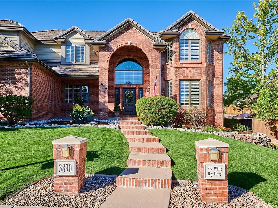 This Designer owned home features custom touches throughout.  The thoughtfully designed kitchen is a chef’s dream featuring knotty alder cabinets, slab granite counter-tops, gas cook-top with custom copper hood, brick accents, and wood beams for your everyday Colorado lifestyle. The main floor features a dramatic curved staircase with hardwood flooring throughout the main level, stairs and up to primary bedroom.  Enjoy cozy evenings in the luxurious family room with soaring ceilings and dramatic brick fireplace!  The formal dining room highlights comfort with crown moldings and intimate location off from the kitchen. Retreat upstairs to the spacious primary suite with a large walk-in closet with custom built-in system for maximum storage.  Additionally, upstairs are 3 secondary bedrooms one with ensuite bath and 2 others sharing a Jack and Jill bath.The basement features a bonus room and 5th bedroom and bath. From the moment you rise until the moment you turn in; you will experience the comfort of resort living in the most joyous Colorado Lifestyle!