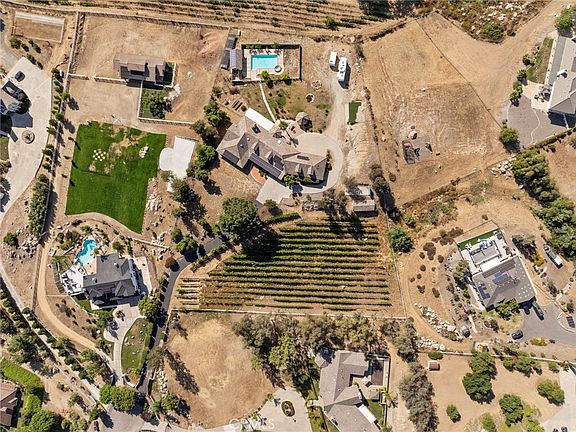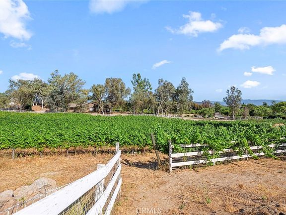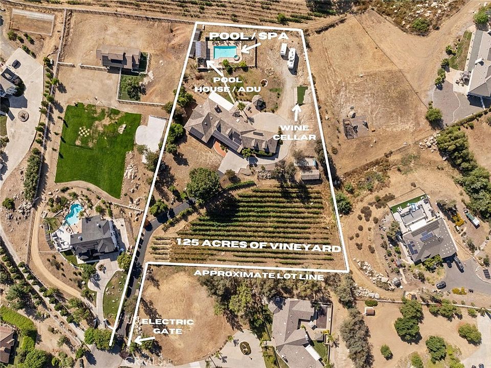 Pool & Spa. ADU. Paid-Off Solar. Vaulted Ceilings. Vineyard + Views. Gated & Fully Fenced & SO much more! Welcome to your dream home in Temecula Wine Country. On nearly 3 acres of usable land, this one-of-a-kind single-story home with an ADU offers luxury and panoramic views of vineyards and breathtaking sunsets and sunrises from every window. Including a paid-off solar system and an additional solar system for the pool, sustainability meets elegance in this meticulously crafted property. The main home features an oversized 3 car garage and spans approximately 3,644 square feet not including the ADU, with 5 spacious bedrooms plus a generously sized office that can easily function as a 6th bedroom. Adjacent to the main residence, the detached ADU provides privacy and comfort, complete with its own AC unit and full bathroom. Perfect for guests or extended family, it's just steps away from the main house. Entertain effortlessly with a resort-like pool and spa surrounded by beautiful landscaping. Indulge in your passion for wine with a detached wine cellar and tasting room, complemented by 1.25 acres of mature Cabernet Sauvignon grapes producing your very own vineyard on site. This exceptional property is enhanced by a wrap-around driveway and gated entrance, ensuring both convenience and security. Situated at the end of a cul-de-sac, rare in wine country, tranquility and exclusivity define your lifestyle here. Located moments away from Temecula's premier wineries and within the distinguished Temecula school district, this is more than a home—it's a retreat where every detail has been thoughtfully considered for luxurious living in one of Southern California's most coveted locations. Don't miss your chance to own this extraordinary estate. Schedule your private tour today and envision life surrounded by the beauty and serenity of Temecula Wine Country.