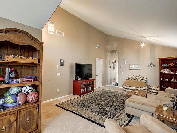 Immaculate and move-in ready home with soaring ceilings, soothing color palette, beautiful ceramic tile floor, and plush neutral carpet in all the right places. North/South exposure. Stunning chefs kitchen features center island, breakfast bar, SS appliances, plant shelves, and white wood cabinets with stylish hardware. Faux white wood blinds newly added. Charming breakfast area with upgraded lighting and lots of natural light. Patio/pool access from family room and master bedroom. Master bedroom boasts large floor plan, huge walk-in closets, custom tiling in bathroom, duel sinks, and separate shower and tub.Refreshing fenced pebble-tec pool with water feature and spa, covered patio, and lush green landscape are perfect for relaxing and entertaining.*AC replaced in 2012