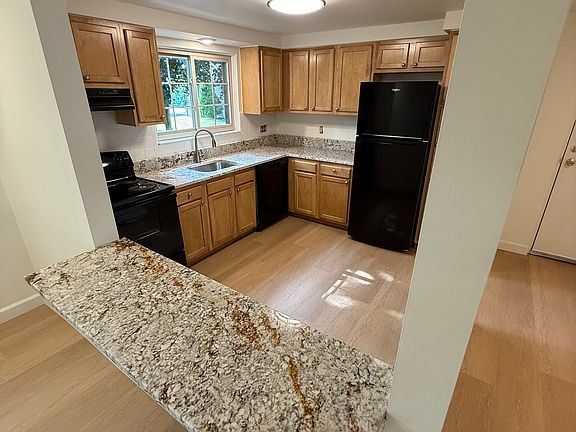 1st floor recently remodeled & freshly painted 2 bedroom/1 bath apartment conveniently located in Amherst just set away from the Consumer Square shopping plaza & Niagara Falls Blvd. Apartment features large entry foyer with double door coat closet. Spacious & bright living room has wall A/C unit that can cool the whole apartment. Large eat-in kitchen with oak cabinets & granite countertops & breakfast bar. Kitchen comes well equipped with stove, refrigerator & dishwasher. Both bedrooms are big enough to accommodate a king sized bedroom set & each has a double door closet. Bathroom has vanity with storage, toilet & tub/shower combo. Brand new wood/LVT flooring throughout the apartment. Each apartment has a private balcony that faces the beautiful & serene courtyard. $1,595.00/month includes water, trash, grounds maintenance & 1 car garage & basement storage area. No smoking bldg. Cats are ok (max 2). $25/month cat rent. 1 year lease. Landlord pays water, trash, grounds maintenance & hall cleaning. Tenant pays own gas & electric. No Smoking building.