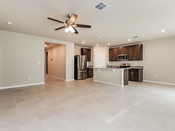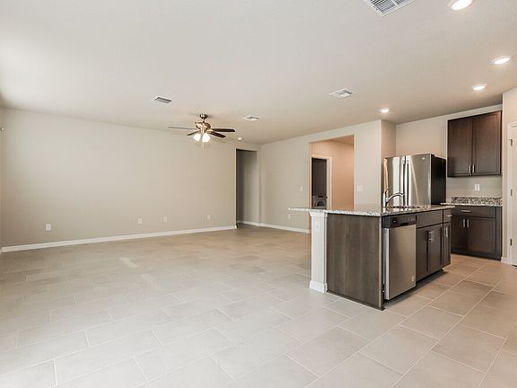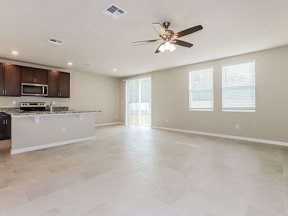 Enjoy all the comforts of living in a brand-new house when you choose this three-bedroom, two-bathroom rental home in Zephyrhills, FL. Start your tour of this single-story smart home in the living room, which has two rear-facing windows and a lighted ceiling fan. Sliding glass doors in the dining area bring in extra natural light. The kitchen is an oasis for home chefs, boasting a roomy center island, sleek countertops, and modern appliances. A double-basin sink and an above-the-range microwave offer extra convenience without skimping on style. Experience the inviting comfort of plush carpeting in the main bedroom suite. The suite's adjoining bathroom beckons with a large shower and two sinks. You're invited to tour this terrific rental home today!