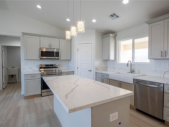 Welcome to this stunning new 3-bedroom, 2-bathroom home offering 1,502 sq. ft. of thoughtfully designed living space. Nestled amidst breathtaking mountain views, this home seamlessly blends modern elegance with practical functionality. The open-concept kitchen serves as the heart of the home, featuring sleek quartz countertops, perfect for cooking and entertaining. The primary suite provides a private retreat, complete with a luxurious en suite bathroom that includes dual sinks and an oversized walk-in shower adorned with porcelain tile. Two additional bedrooms are conveniently located off a central hallway, accompanied by a full bathroom with a shower and tub combination, making it ideal for family or guests. The low-maintenance front yard is beautifully landscaped with desert-inspired details, adding to the home’s charm and curb appeal. Don’t miss your chance to own this modern gem, where style, comfort, and nature come together in perfect harmony!