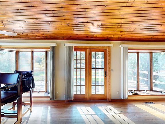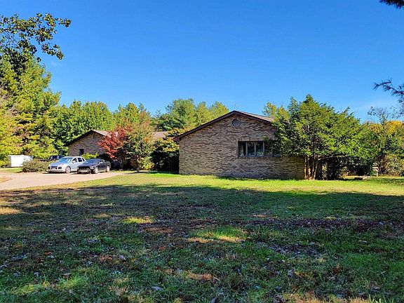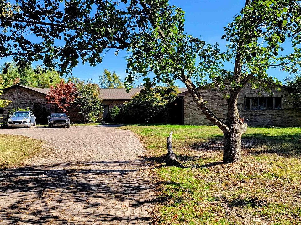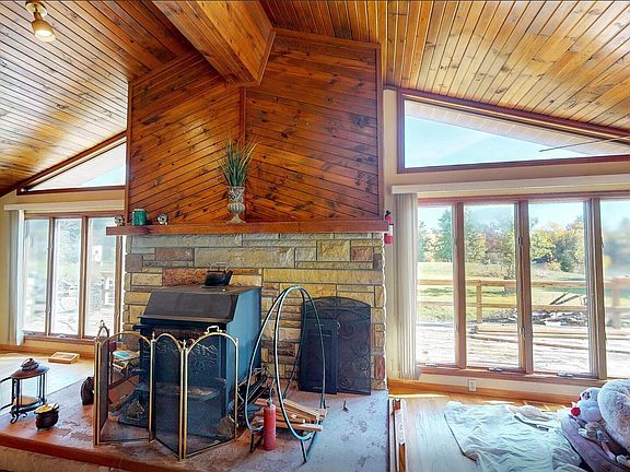 Welcome home to this charming 3-bedroom, 3-bathroom ranch on approximately 24 acres with a pond and stunning views. A paver driveway and mature landscaping welcome you upon arrival. Inside, French doors lead from the foyer into the great room featuring a high vaulted wood ceiling, pool table, and wood-burning fireplace. Natural light floods through two walls of floor-to-ceiling windows and French doors opening to the deck. Down the hallway, two secondary bedrooms flank either side with a shared full bathroom. The spacious primary bedroom at the hall's end offers front yard views and an ensuite with dual sinks, recessed lighting, and glass block shower. French doors on the opposite side of the great room reveal the kitchen with cherry wood cabinetry, stainless steel appliances, and an elongated island featuring a breakfast bar, built-in cabinetry, and cooktop. The spacious laundry room off the kitchen provides ample cabinet space. The full hall bathroom includes a jetted tub and sauna for ultimate relaxation. The den at the hall's end boasts a full wet bar and generous space for an office, home gym, or game room, plus garage access. The 4-car garage features a mechanic lift, storage, and workshop space. The property includes a pond, 18 tillable acres, and three outbuildings (20x40, 20x30, and 45x60 with concrete floor). Don't miss this homestead oasis! Please include any and all buyer requests in the offer to be presented for consideration.