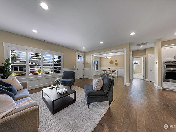 An exceptional, corner lot home for the downtown Gig Harbor lifestyle! 5 min walk to the heart of Harborview Drive with the marina, bars, restaurants, boutiques & farmers market. Explore the many nearby parks & listen to the Summer Sounds at Skansie! Custom-built home with luxury finishes-coved ceilings, wainscotting, quartz countertops & more. Main floor living with primary bedroom & magnificent 5-pc bath. Peek-a-boo harbor & city views from living room & primary. Open concept kitchen, dining & living room-perfect for entertaining! Lower level media room (multi-purpose), 2 bedrooms & full bath. High ceilings add to the spacious feel of this home. 2-car, oversized, insulated garage. Air conditioning. Custom blinds & shutters. A Must see!