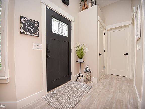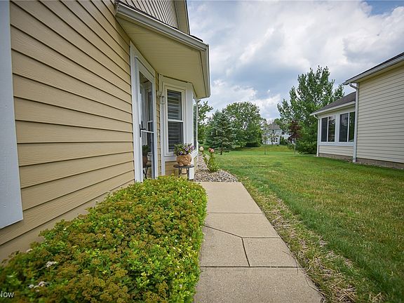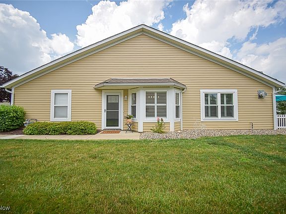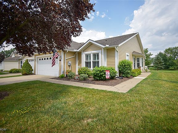 Welcome to this immaculate ranch home, beautifully renovated from top to bottom, offering effortless one-level living with 2 bedrooms, 2 full bathrooms, and an attached 2-car garage. From the moment you walk through the front door, you'll be impressed by the open-concept design, stylish finishes, and thoughtful layout. The bright, modern kitchen features white shaker cabinets, a tile backsplash, quartz countertops, stainless steel appliances, a breakfast bar, and plenty of storage—perfect for both everyday living and entertaining. Just across from the kitchen, the dining area flows seamlessly into the spacious living room, where vaulted ceilings and a stone feature wall with a dual-vented gas fireplace create a cozy yet elegant atmosphere. Sliding glass doors lead out to a private patio overlooking peaceful green space—ideal for relaxing or grilling. The primary suite is a true retreat with two walk-in closets and a luxurious private bath complete with a dual-sink vanity, tiled shower, and glass enclosure. The second bedroom, located on the opposite wing of the home, also features two custom closets and easy access to a beautifully updated guest bath. Additional highlights include a convenient laundry room, utility closet with newer mechanicals, and interior access to the garage, which is equipped with built-in cabinetry for added storage. Additional updates include new windows installed in August 2024, a hot water tank replaced in 2018, and HVAC in 2017. The home also features fresh paint and new flooring throughout, recessed lighting and ceiling fans, newly landscaped exterior with stone accents, and an attic that has been framed for additional storage. This home combines style, comfort, and function—truly nothing to do but move in and enjoy!