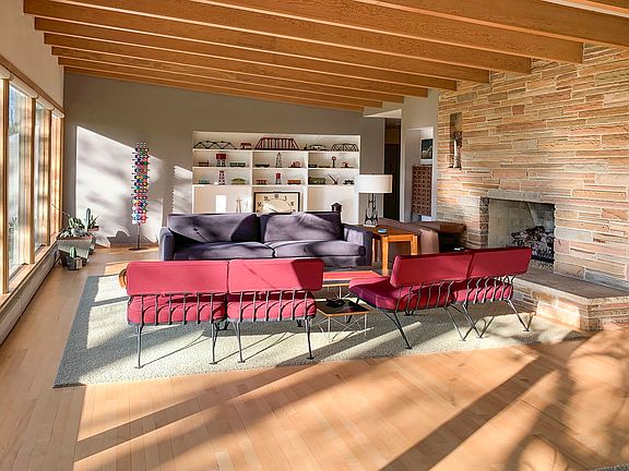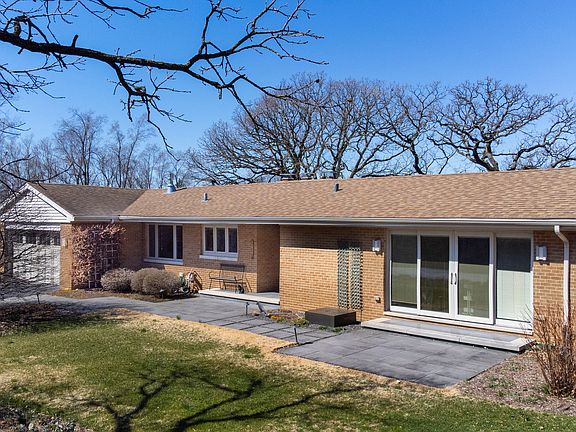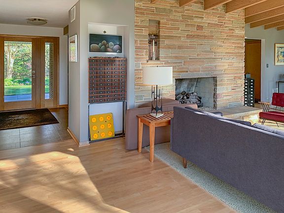 Beautiful all brick Mid Century Modern ranch. All the charm of the original dramatic home with all the 21st-century updates! Updated custom kitchen cabinets - 2005: Basement remodel, fireplace conversion to gas and a new bathroom with tile shower - 2009: Major renovation,New primary bath with separate tile shower and tub; new powder room; new birch flooring throughout except for large format tile in entrance hall and bathrooms; new Pella windows with integrated blinds throughout; new 12' Pella sliding door system leading to front patio; new wood doors throughout including custom front door with sidelights; new radiator covers throughout house; new boiler and roof-2010: Extensive exterior project. Replaced sidewalks, new front patio; new large 2-level Azek deck with stainless steel railings; new enclosed concrete storage space under deck for lawn tractor, kayaks, and outdoor furniture; new French doors and windows leading from living room to deck -2015: Kitchen update. New birch floors, new gas fireplace with Ann Sacks tile surround, new quartz countertops, new Wolf cooktop and wall oven / steam oven combination. New custom fountain by front patio-Ongoing: Professional landscape design with 15 trees planted and extensive perennial beds throughout the property