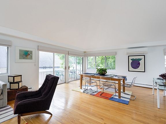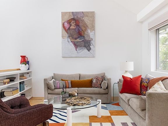 Outstanding location, modern design, and light filled spaces distinguish this south facing three-floor corner townhouse overlooking the trees. The apartment is a rare find which has been sold only once in 35 years. The second level has two bedrooms and full bathroom. The top floor reveals bright space with a dramatic 17-foot cathedral ceiling which will take your breath away. The open plan living/dining room is filled with light all day and the sun pours in the evening golden hours. A south-facing balcony is reached through sliding glass doors. The white kitchen has clean lines, pantry, and large island--perfect for entertaining. The large main bedroom suite includes twin closets and full bathroom with double vanity. The first-floor entryway leads to a private brick patio and the unit has assigned off-street parking for one car. This well run 6-unit condo association is a short distance from Harvard and Central Squares, Cambridge Public Library, shops, restaurants, and Red Line “T”.