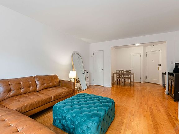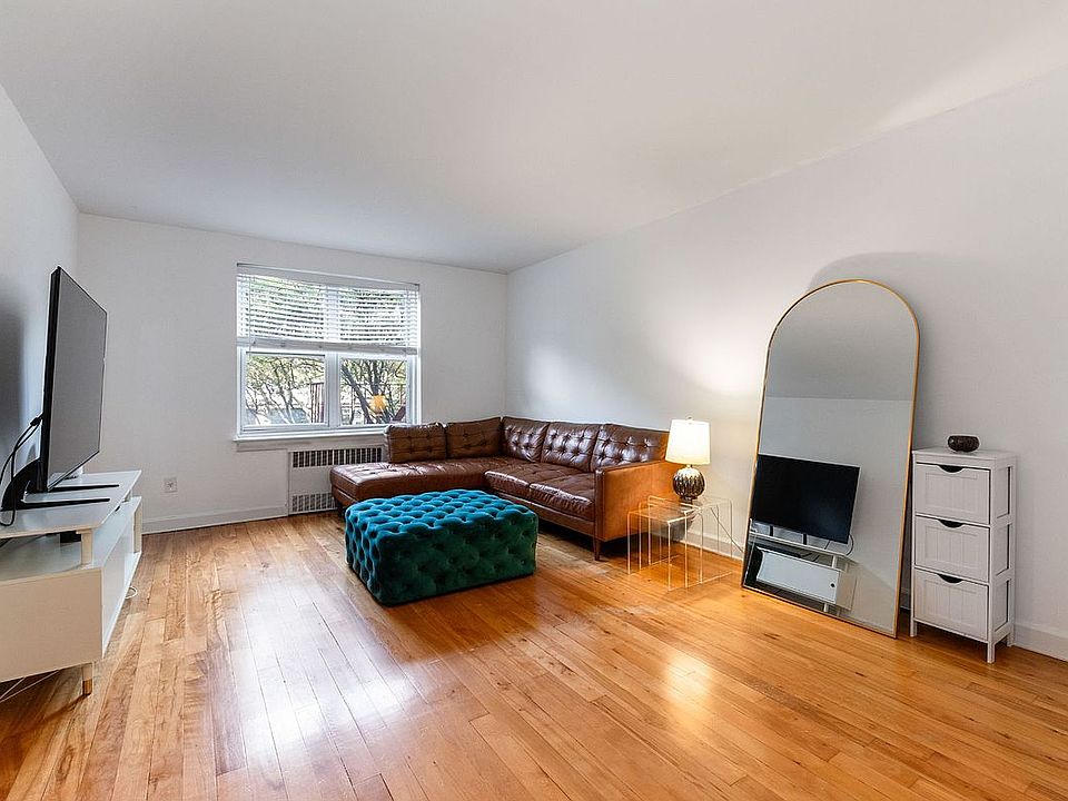 Experience the perfect blend of postwar charm and modern sophistication in this bright and airy one-bedroom apartment. Upon entering, you'll be greeted by stunning hardwood floors and an abundance of natural light streaming in from the west and south-facing windows. A versatile space immediately to your right can serve as either a home office or a dining area, comfortably accommodating a table for four.