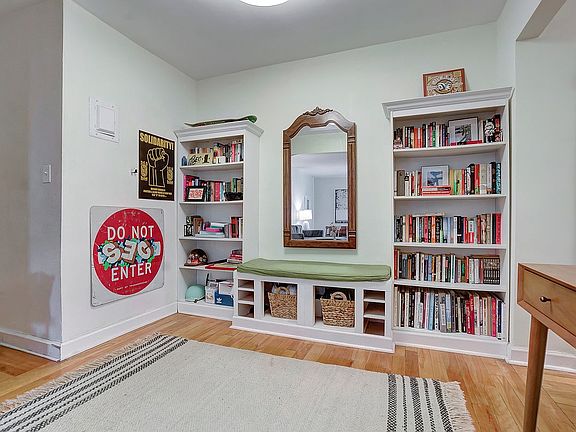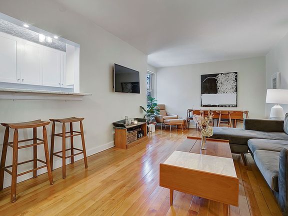 This unit opens to a large foyer with built-in bookshelves and seated bench area, which could also be used as a dining area. Off to the right is a large, windowed & sunny living room. Windowed, designer kitchen features Whirlpool Gold stainless steel appliances and granite countertops with an opening looking into the living room - which can serve as a small, seated bar area with barstools on opposite side. Modern bathroom with pedestal sink and bathtub. The corner bedroom can fit a king size bed as well as a desk, or additional furniture, and features two windows. Refinished Hardwood Floors throughout the unit.
