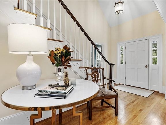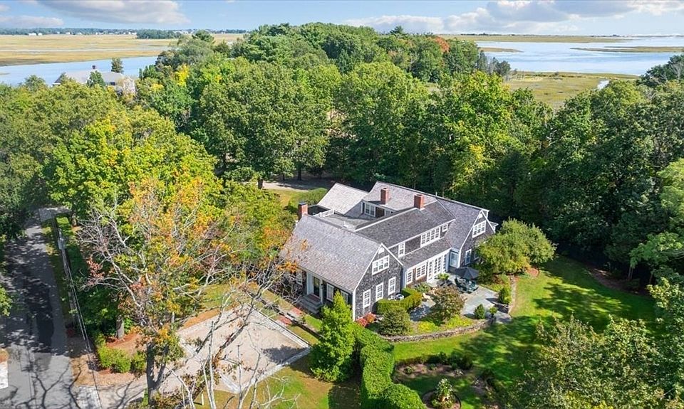 An extraordinary opportunity offering the best of Powder Point. This exceptional home, never before on the market, is set on a beautifully landscaped level acre of an exclusive lane leading to the water. This gracious home offers the perfect balance of privacy and accessibility, with 5800 sf, 5BR, 7 baths and was masterfully reimagined, expanded and renovated with exceptional detail and handsome custom finishes. A stunning sunlit kitchen features marble counters, butler's pantry, an oversized brick fireplace & French doors leading to a stone terrace and exquisite English gardens.Open living & family rooms with 2 additional fireplaces flow to an outdoor covered porch with iconic handmade gas lanterns and beautiful water views, magnificent sunsets and superb entertaining space. The expansive first floor main suite with garden views has full baths, walk-in closets, and a dressing room. Enjoy water access and a mooring - a rare opportunity blending timeless luxury with extraordinary charm.