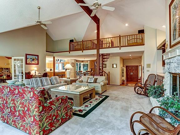 If you want to spread your wings this is the home for you! Extremely spacious and open, perfect for entertaining with lots of interesting aspects. Nestled in a very private, natural environment on a large lot with golf course views from the kitchen. High vaulted ceilings with a wall of glass overlooking a private courtyard, wood vaulted ceilings in the family room and kitchen. A central gas fireplace with built-in wood cabinets, a wet bar and space for media is in the great room and double sliders open to a series of outdoor decks and spaces to enjoy and relax. From the family room another set of double sliders open to the outdoors plus an enclosed sunroom. The master suite has a private deck and the bath offers a whirlpool tub, separate sink areas and 2 walk-in closets. All bedrooms have a private bath and kids will love the loft accessed by a wooden spiral staircase. You'll find more than ample storage space in this home plus a workshop and walk-up attic. Easy beach access.