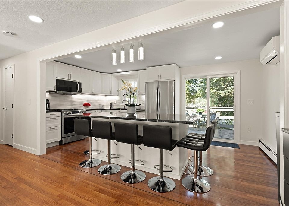 This sun-filled, well-maintained split-level home is move-in ready with 3 bedrooms and 2 full baths, 2 driveways. Hardwood floors span much of main level, where a brand-new kitchen w/sleek cabinetry, countertops, appliances (2025), and an oversized island that seats 8 comfortably, opens to the living room and deck—perfect for gatherings. The living room features a large picture window, filling the space with natural light. Down the hall are three comfortable bedrooms and a full bath with dual access. The walk-out lower level offers a front-to-back family room with fireplace, sliders to the fenced yard, a second full bath, and a spacious laundry room with cabinetry and granite countertops. Recent updates include roof (2023), windows, driveway, recessed lighting, sliding doors, and heat pump ( all 2025), plus a mini-split A/C (2025) and EV charger. Sited on a level 10,000 sq. ft. lot across from a park, and close to shopping/dining, a lake with beach, and the T for easy ride to Boston.