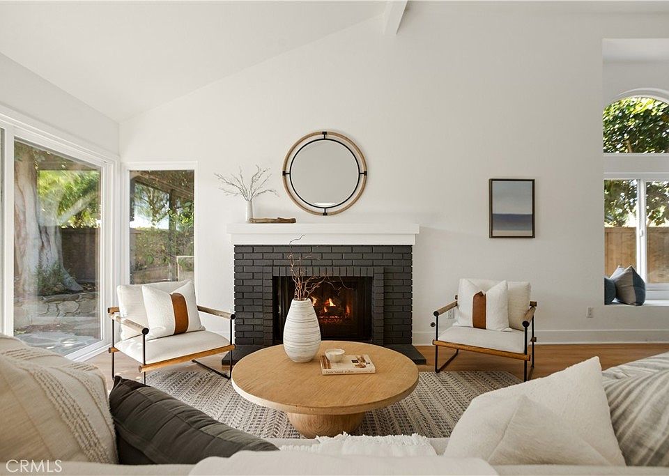 Showcasing today’s preferred interior design aesthetic with a complete remodel and high-end upgrades, this open-concept single-level home offers a coveted turnkey opportunity in Laguna Hills’ intimate Indian Creek enclave. An abundance of large windows welcomes natural light that illuminates vaulted ceilings in most living spaces, and fashionable wide-plank luxury vinyl flooring throughout that is virtually indistinguishable from natural wood. Approximately 1,549 square feet, the move-in-ready residence presents three bedrooms and two redesigned baths, including one bedroom that is currently featured as an office with window seat. Another built-in seat set under and arched window embellishes the dining room, and a fireplace lends style to a spacious living room that opens to the backyard. Undeniably on trend, the kitchen hosts a bright breakfast nook with backyard access, peninsula bar, white Shaker cabinetry with glass uppers and crown molding, a full tile backsplash, handsome stone countertops and brand-new stainless steel GE appliances. Backyard views enhance the secondary bedroom, where a ladder leads to a versatile loft. In the primary suite, generous space is accented by a vaulted ceiling, private enclosed patio, two closets, a shower with built-in seat, and dual sinks set in an elegant marble countertop. For added convenience, a detached two-car garage reveals built-in cabinetry and epoxy-finished flooring. Enjoy the pleasures of outdoor entertaining in a private backyard with flagstone patio, built-in BBQ bar, in-ground spa and colorful garden. Indian Creek is located in the heart of Laguna Hills. Just a short drive from the shores of Laguna Beach, the desirable community is close to shopping centers, restaurants, Aliso Creek Trail, open space, Sheep Hills Park, a dog park, and Aliso & Wood Canyons Wilderness Park. Award-winning schools are close to home, including Laguna Hills High School.
