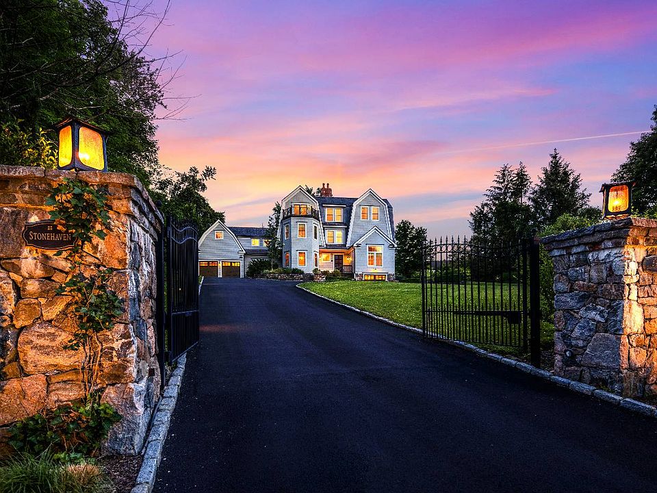 INTRODUCING STONEHAVEN, a sensational Nantucket-inspired custom masterpiece minutes from Ridgefield Village. Behind a private stone wall, nestled on a berm covered in mature junipers affording a sense of grandeur, awaits this refined and luxurious shingle and stone residence with distinctive curb appeal. Custom designed and built in 2005, this 4 bedroom, 4 bath home is a striking blend of stylish sophistication and superior craftsmanship. Extensive stone walls, half-round copper gutters, sprawling wraparound flagstone patios, and exceptional architecture are just a few of the features that put this property in a league of its own. Gracious front entry beautifully flows into impressive interiors across 3 levels with high ceilings and exquisite details. Open floor plan, combined with private retreats, offers space for everyone. A show-stopping gourmet chefs kitchen is bright and airy with soaring 20ft ceilings and walls of windows. The 2nd level is home to a lavish primary suite oasis with spacious bedroom, spa-like en suite bathroom, walk-in closet, and sitting area made cozy with a fireplace. An additional bedroom, another full bathroom, and conveniently placed laundry further embody form and function. Versatile 3rd floor is adorned with a mahogany-lined and coffered-ceiling library with fireplace, 4th bedroom, full bathroom, and substantial bonus room. French glass doors open to upper-level balcony, showcasing charming countryside views. Expansive unfinished lower level is ready for future expansion. Heated, cooled, and with its own fireplace. Tandem 3-car garage with finished room (heated and cooled) above the attached primary 2-car garage. Whole house generator, central vacuum, irrigation system, speakers in ceilings throughout 1st floor and primary suite, and so much more to love. Easy access to primary commuter routes. The perfect place to call home!
