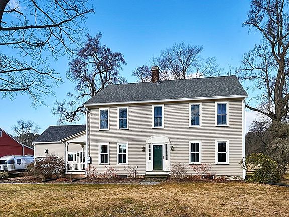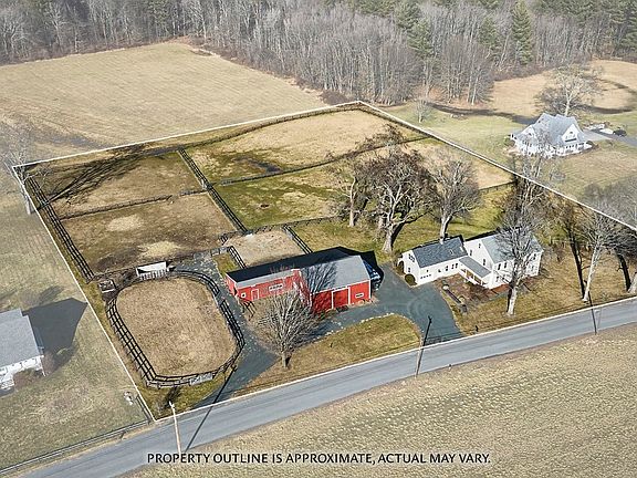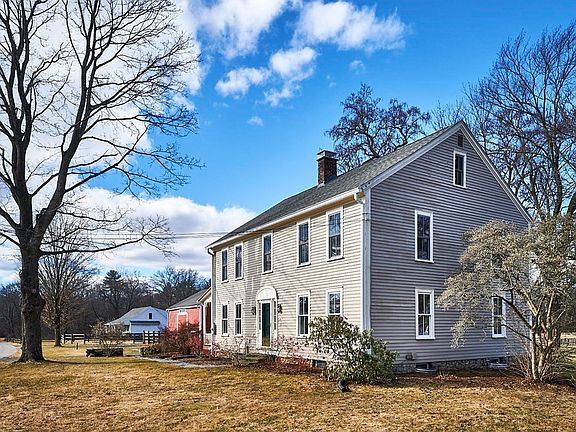 Elegant and sun-filled 4-5 bedroom, 2 bath farmhouse with quintessential red barn sited on 4 bucolic acres with sweeping views in all directions and abutting preserved farmland and adjacent 734-acre Arcadia Audubon Wildlife Sanctuary. The perfect blend of classic colonial character and top-quality renovations provide for superb entertaining and contemporary living. Authentic period details include wide pine and hardwood floors, substantial chestnut and oak trim, and exposed post and beam elements. The updated kitchen features cherry cabinets, honed granite counters, cathedral ceilings, farm sink, and a cozy woodstove. Other modern amenities include first floor bedroom and full bath, office, gracious mudroom with built-ins, and large bonus room over the garage. Enjoy long views from the sweet front porch and large screened-in back porch. The 8-stall barn has been updated and upgraded and includes tool and tack rooms, water, and electricity and opens to rinks, paddocks, and fields.