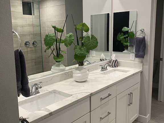 Four year old home with many upgrades located in the prestigious 55+ senior community if Del Webb Lake Las Vegas. The entrance is spacious that leads into a single-story, open-concept design with 10ft ceilings. The house has three bedrooms plus a study, open floor plan, covered patio, large open kitchen design. There is a walk-in laundry room equipped w/overhead storage & a sink. The primary bathroom features dual sinks, accompanied by a sizable walk-in closet within the primary suite. Enjoy the comfort of 3 bedrooms enhanced by the addition of new shutters throughout the entire house. The exterior features desert landscaping & pavers in the backyard.