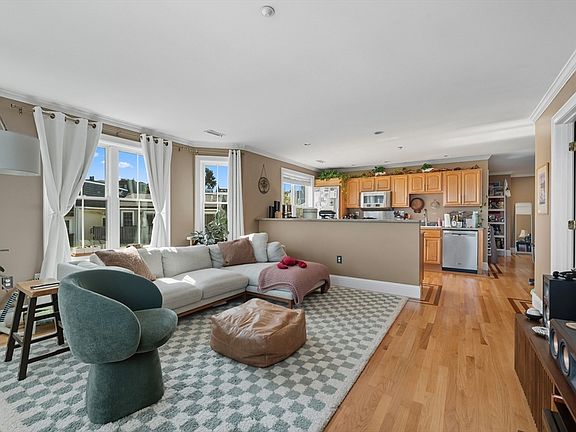Enjoy sunlit living in this contemporary expanse with TWO garage parking spots in one of Boston's hottest neighborhoods. Tree top views with glimpses of skyline through many oversized windows + gorgeous wood floors w/cherry inlay. Open floor plan invites entertaining and relaxing with dining area and breakfast peninsula showcasing plenty of cabinetry with granite topped workspaces and a full complement of stainless appliances. Both bedrooms are generously sized and the primary offers a designer en-suite bath, great closet and adjacent laundry. Upstairs reveals a common roofdeck with panoramic views of the city. Enjoy living in the heart of all the dining, shopping, nightlife and events that fill your daily feeds! Easy access to one of the few urban public beaches, nearby marina and all the outdoor recreation Southie offers. Commuting options abound along bike paths, lots of public transport and highway access in and out of town, Logan Airport + So. Station.