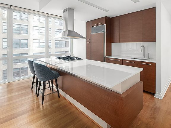 An entry foyer with large coat closet leads the large living and dining room. The open chef's kitchen features abundant Crystal White countertops and Wenge Wood cabinetry, as well as a Wenge-paneled Sub-Zero refrigeration and a Fisher-Paykel dishwasher. The large kitchen island can easily fit three stools.